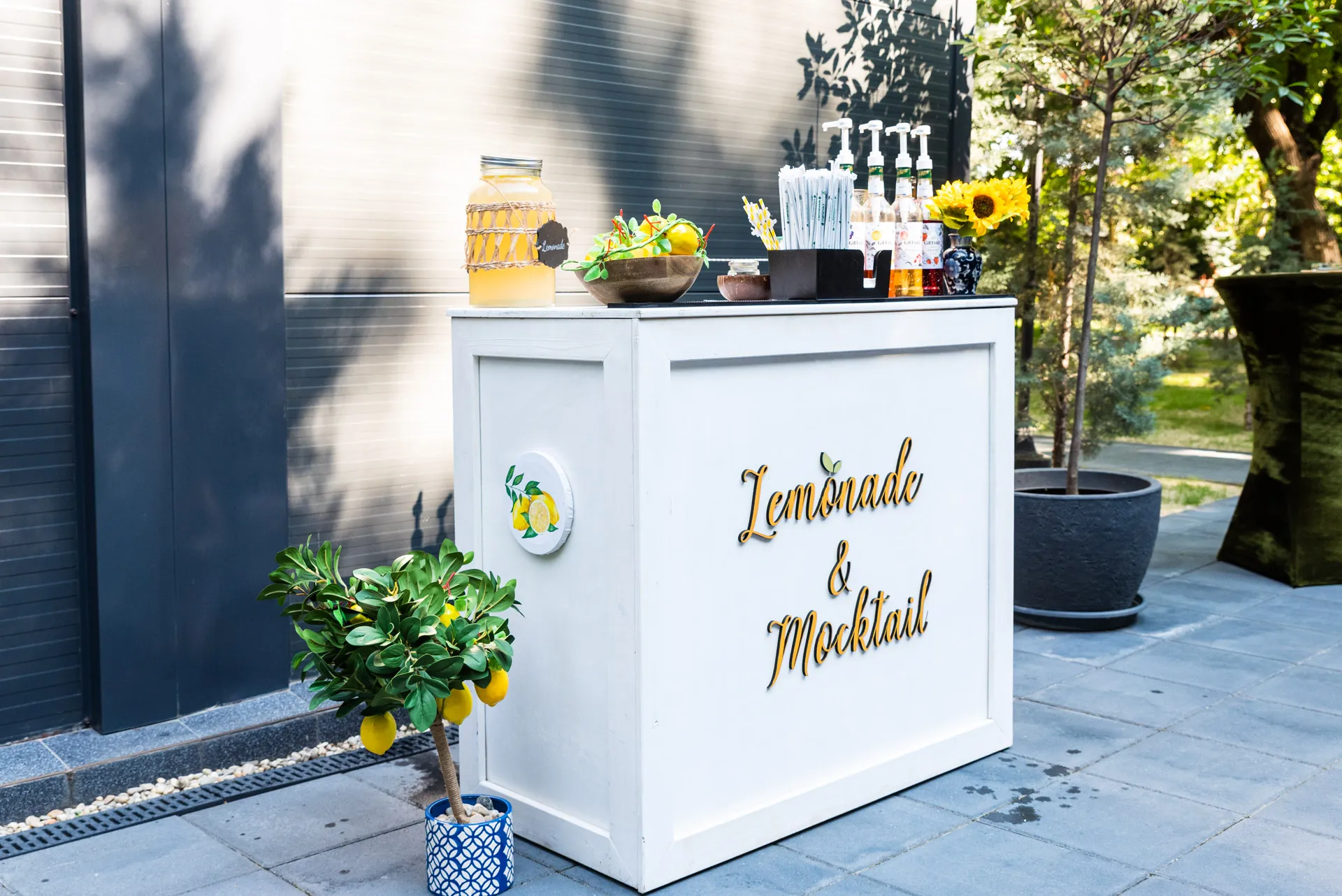 Pachetul All-Inclusive cuprinde: stand mobil tematic cu design adaptabil (rustic, modern), meniu diversificat de limonade artizanale din ingrediente 100% naturale, dispensere elegante și pahare, gheață, fructe proaspete și garnish, setup complet, transport și logistica asigurată. Practic, nu trebuie sa te preocupi de nimic legat de zona de bar.